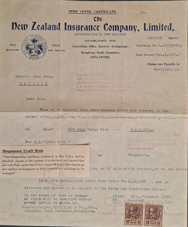 Thailand General Revenue stamps issued April 1933 on insurance document. Insurance for 300 bags of rice done in 1937. Quite a late usage of these provisional revenue stamps. The stamps are overprinted on 1928 king Rama 7 postage stamps.